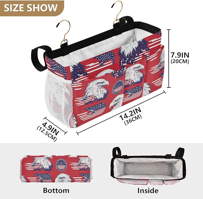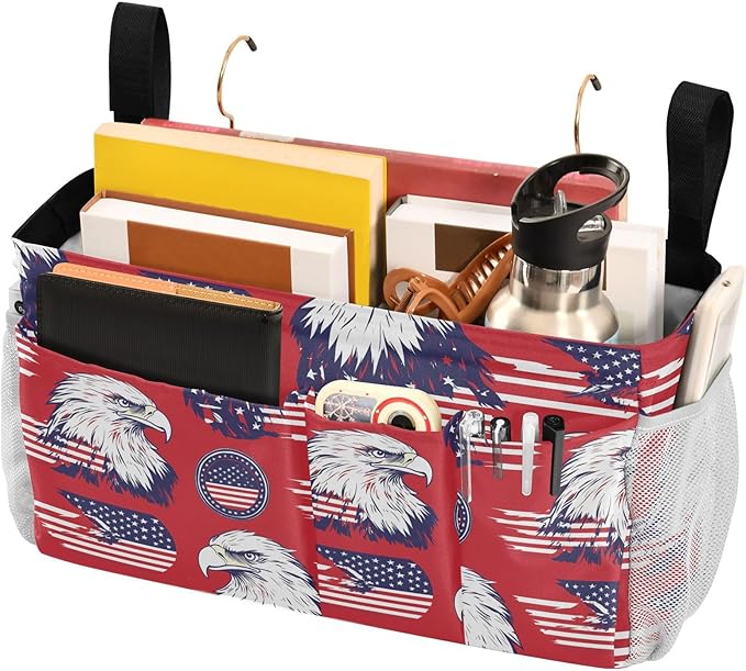 American Flag Bald Eagle Red Bedside Caddy for Dorm Bed Bedside Hanging Caddy Bag Iron Frame Storage Organizer Pocket for Bunk Home College Hospital Beds 2 Hooks
