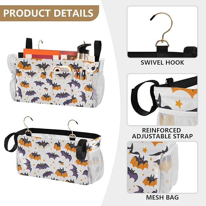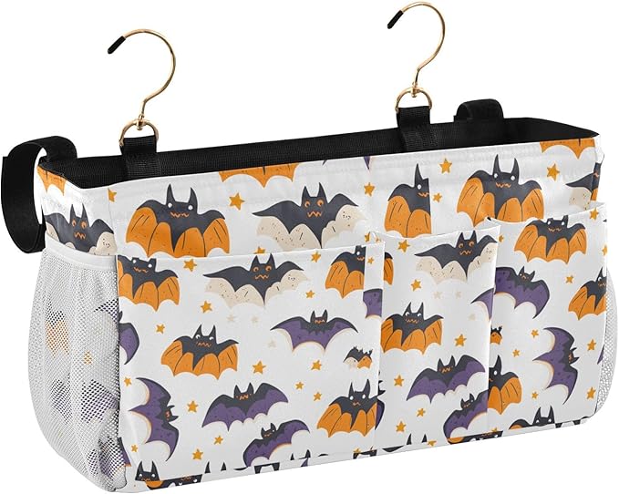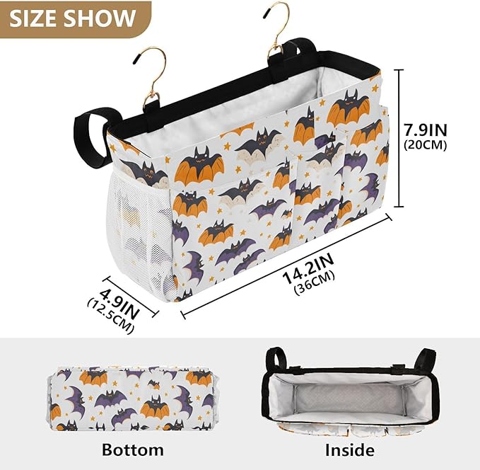 White Halloween Bats and Stars Bedside Caddy for Dorm Bed Bedside Hanging Caddy Bag Iron Frame Storage Organizer Pocket for Bunk Home College Hospital Beds 2 Hooks