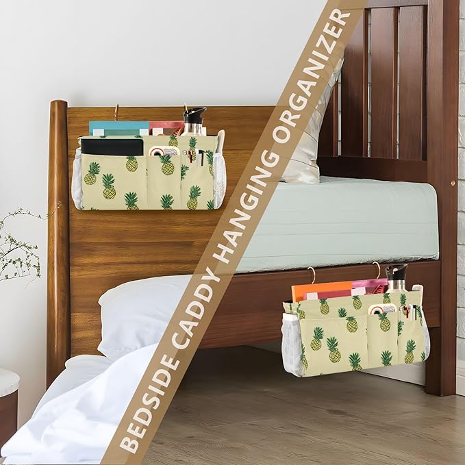 Light Yellow Pineapple01 Bedside Caddy for Dorm Bed Bedside Hanging Caddy Bag Iron Frame Storage Organizer Pocket for Bunk Home College Hospital Beds 2 Hooks