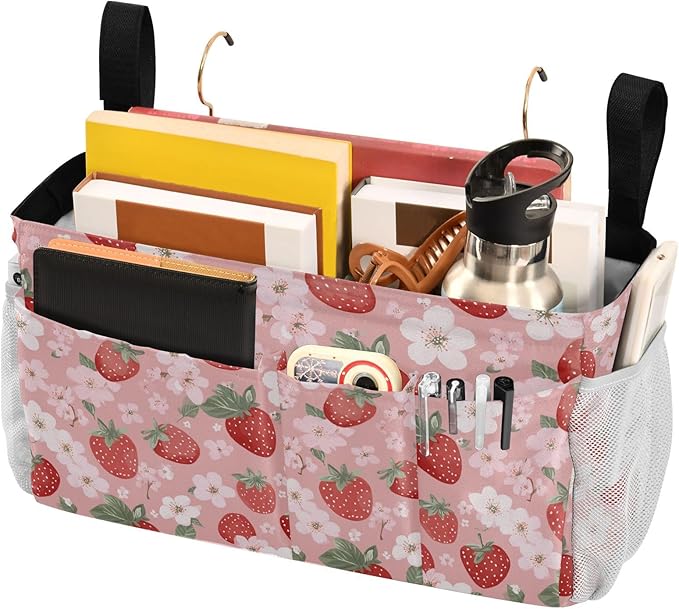 Pink Blossoms and Strawberries Bedside Caddy for Dorm Bed Bedside Hanging Caddy Bag Iron Frame Storage Organizer Pocket for Bunk Home College Hospital Beds 2 Hooks