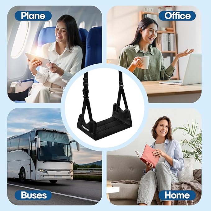- [Adjustable Strap for Comfort]: Easily extend the strap from 19.68 to 36.22 inches to match different seat heights. Whether on a flight, train, or at your desk, enjoy personalized support that reduces leg strain during long sitting.