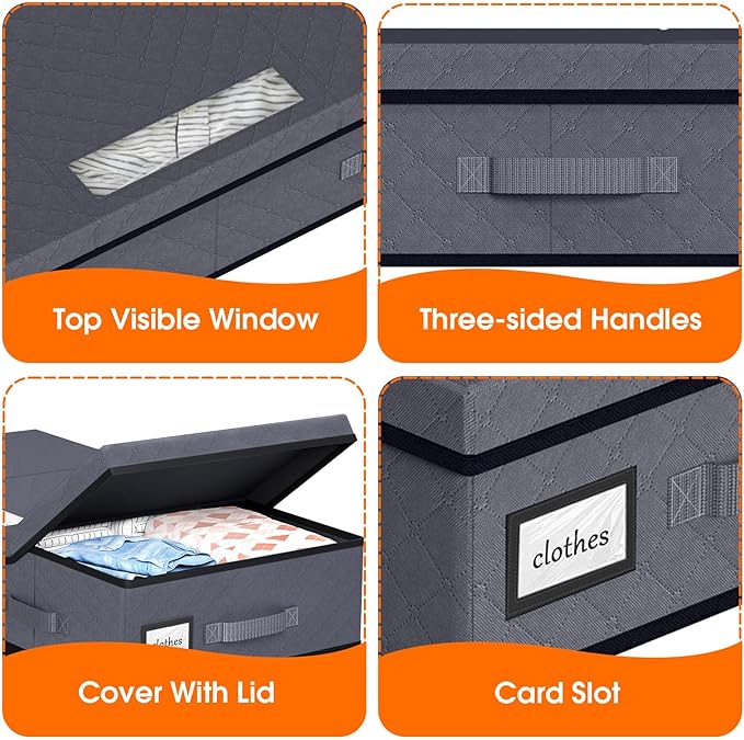 Under Bed Storage Containers with Lids - 3 Pack, Foldable and Stackable Clothes Storage Bags with Clear Window, 3-Sided Handles and Label Slot for Clothing, Blankets, Pillows (Grey)