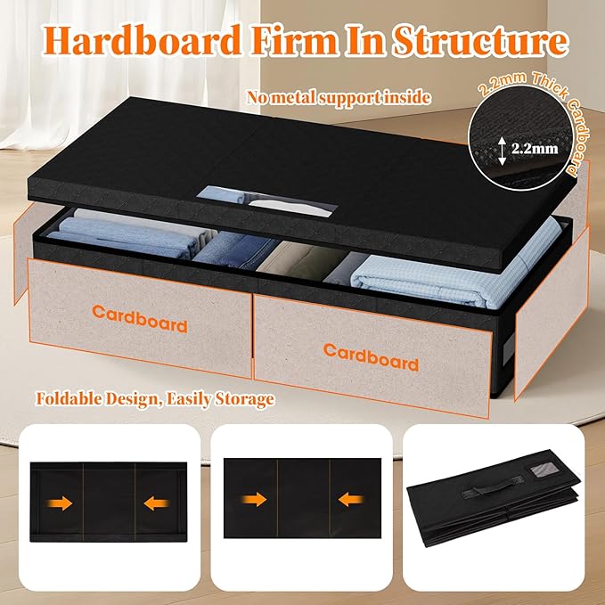 Under Bed Storage Containers with Lids - 2 Pack, Foldable and Stackable Clothes Storage Bags with Clear Window, 3-Sided Handles and Label Slot for Clothing, Blankets, Pillows (Black)