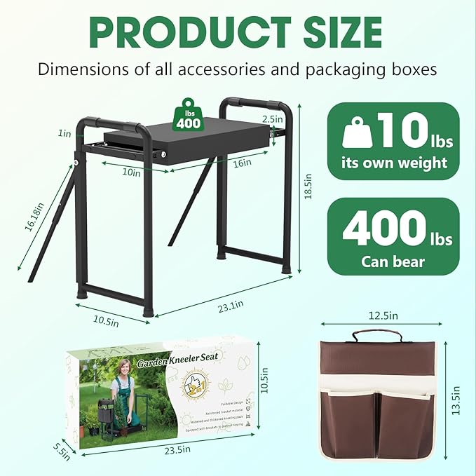 - 【EASY FOLDING & LARGE TOOL BAG INCLUDED】Features a convenient carry handle and effortless folding mechanism for compact storage and transportation. The included multi-pocket tool organizer bag keeps all your gardening tools neatly at hand, eliminating clutter and saving you time.