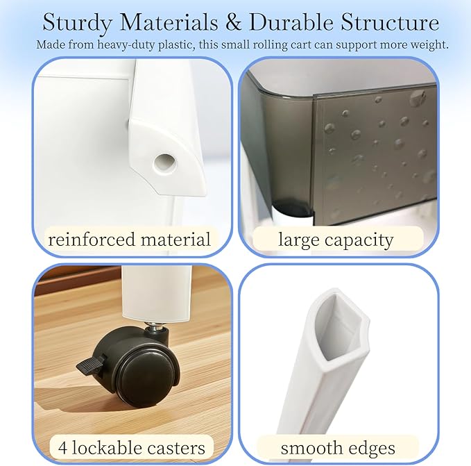- 【Sturdy Material and Easy to Clean】This small rolling cart on wheels is constructed from high-quality, heavy-duty, and rust-resistant plastic that resists bending and warping. This ensures long-term structural integrity and reliability. The mini cart is perfectly capable of handling daily storage for bathroom and laundry essentials (cleaning supplies