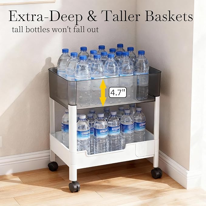 - 【Extra-deeper Basket Design for Tall Bottles】LiWNYRK under desk storage cart has deeper basket (4.7 inch), making it perfect to storing tall bottles(suitable for pantry room, laundry room, kitchen, vanity and bathroom). No worry about bottles falling out. The flat base design securely holds various bottles in place