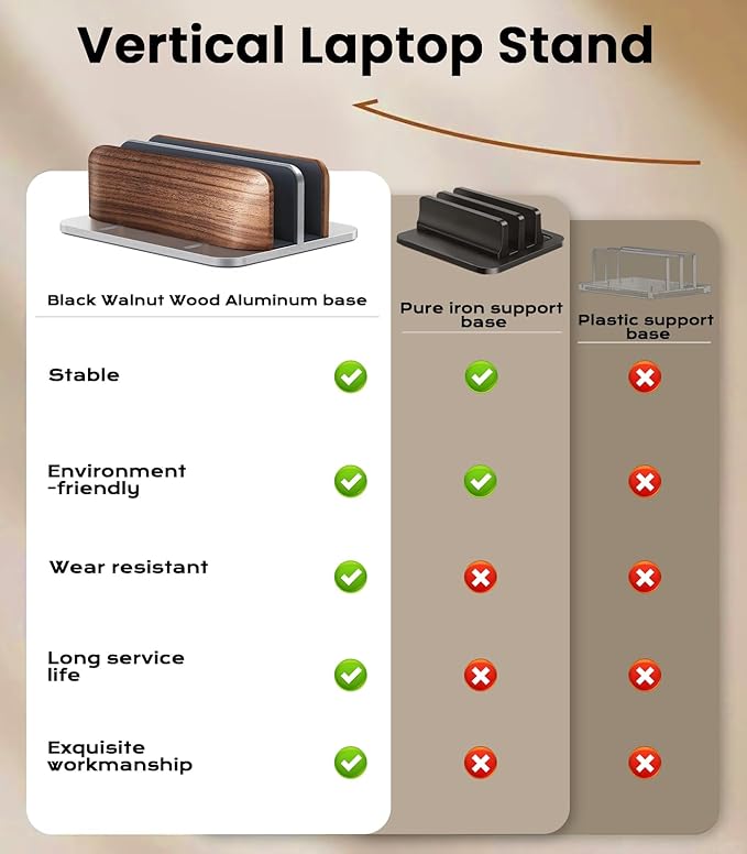 - โ๏ธ[Premium Walnut Wood & Aluminum Design] - The macbook stand vertical combines black walnut wood with a high-quality aluminum alloy base inspired by modern North American interior design. The aluminum finish matches MacBook aesthetics and blends seamlessly into home or office environments