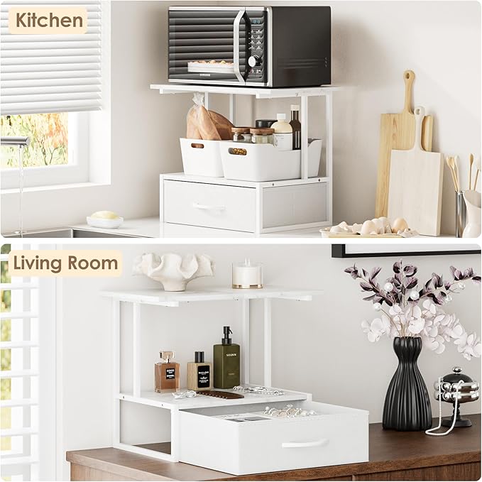 Masupu Printer Stand for Desk, Printer Table with Fabric Storage Drawer, 2 Tier Desktop Shelf, Multi-Purpose Desk Organizer for Home Office, 3D Printer, Fax Machine, Scanner, Marble White
