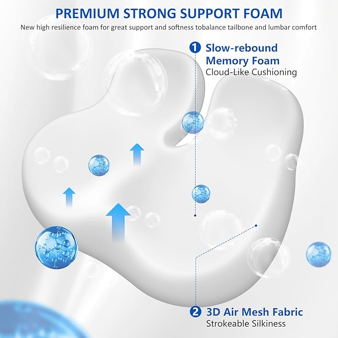 - Ergonomic Designs for Effective, Targeted Relief: This coccyx cushion for tailbone pain is ergonomically shaped for sitting relief. The U-shaped cutout effectively reduces coccyx pressure, while the W-shaped front distributes thigh pressure to enhance blood circulation. These thoughtful features make this cushion the perfect solution for relieving sciatica, tailbone pain, lower back discomfort, leg aches, and hip pain during long hours of sitting