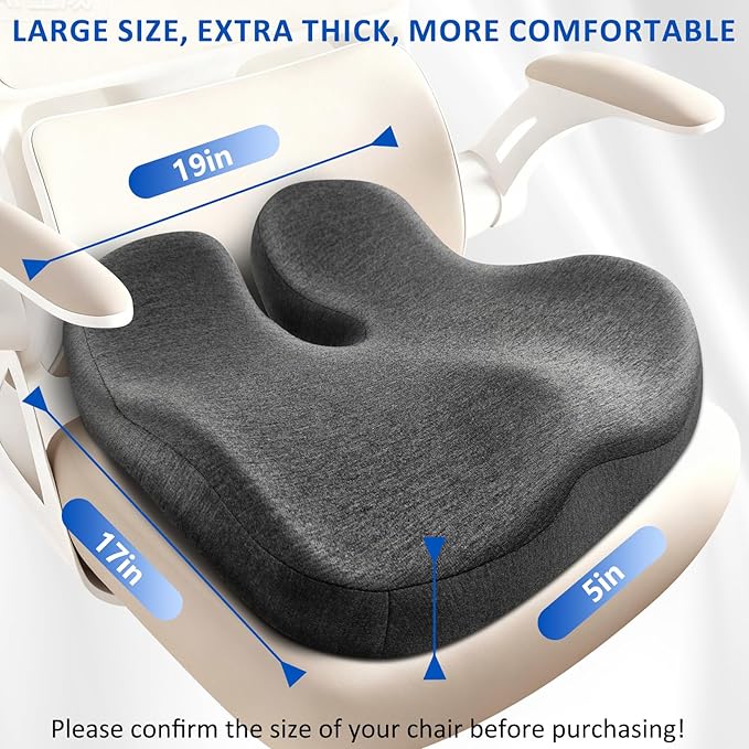 - Larger & Thicker for Lasting Support:Measuring 19 x 17 x 5 inches, this tailbone pain relief cushion features thick high-density memory foam that adaptively conforms to your hip curves. The seat cushions for office chairs provide enhanced support. Say goodbye to poor support and flattened cushions,enjoy lasting comfort every time you sit