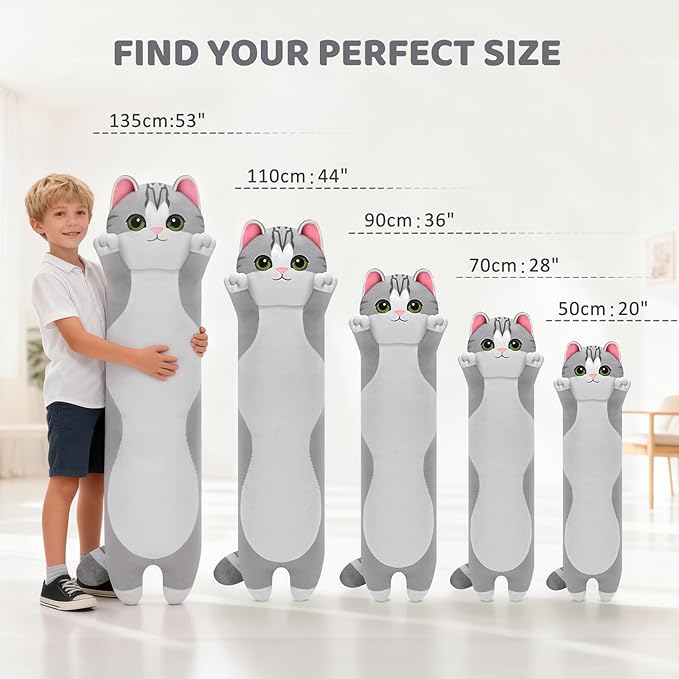 - Mewaii long Plush Pillow Sizes: 50cm/19.6Inch, 70cm/27.6Inch, 90cm/35.4inch, 110cm/43.3Inch, and 135cm/ 53.2Inch. They are bigger than you imagine, plumper than you expect, and bring you fully envelopment.