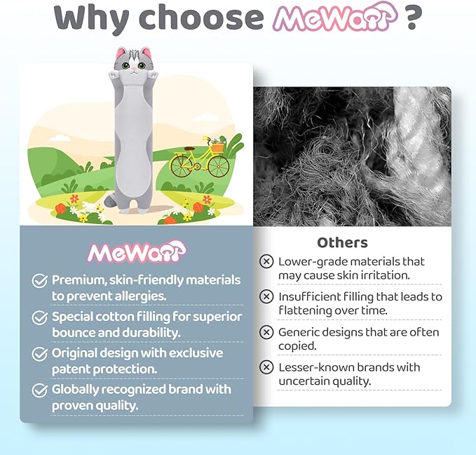 Mewaii Artist-Designed Ultra Soft Long Cat Plush Body Pillow, Extra Stuffing for Comfort, Premium Quality Stuffed Animal Gift for Girlfriend or Cat Lovers (Grey Body Pillow 44 Inch)