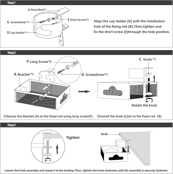 - Simple Installation: The under-desk storage tray is easy to operate. Follow the instructions for a 1-minute setup. The cup holder can be flexibly installed as needed, freeing up more desk space.
