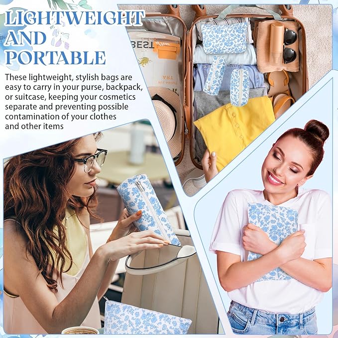 - Material and Attractive Design: the makeup and toiletry travel bag set is mainly crafted from quality corduroy material, ensuring high durability and prolonged service life; The bags feature an adorable and delicate design with scattered cute blue flower in different sizes on the white color surface; This makes them compatible with various styles of outfits