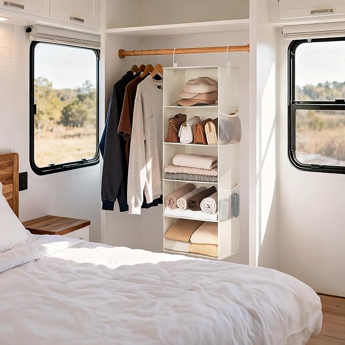 - Versatile hanging clothes organizer for storing sweaters, towels, jeans, pants, t-shirts, handbags, shirts, pants, hats, shoes, and other items in wardrobes, dorms, kids' rooms, trailers, or RVs.