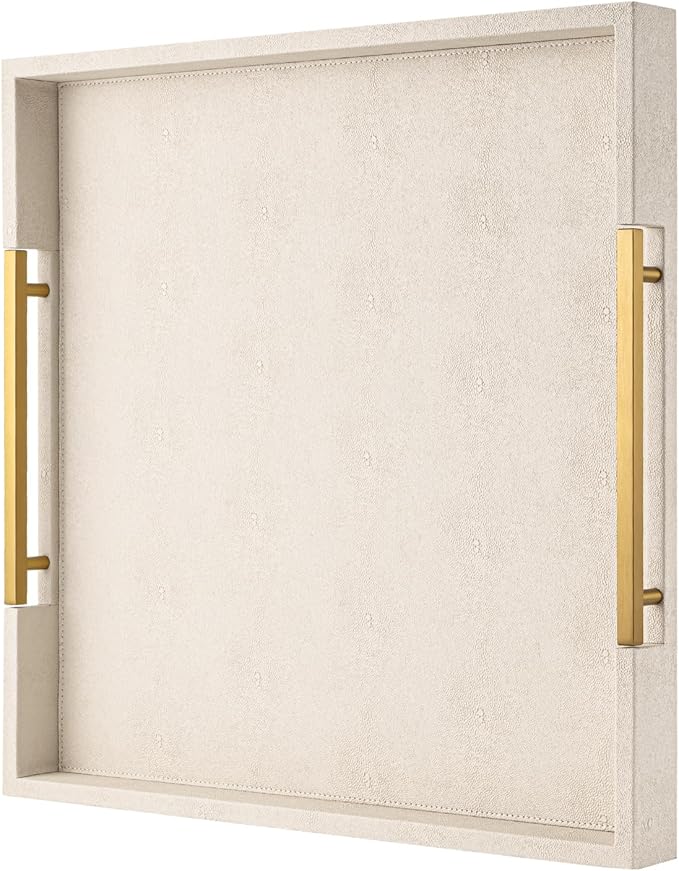 Beige Faux Leather Serving Tray with Handles – Large Decorative Tray for Coffee Table, Ottoman, Living Room, Bathroom – Home Decor