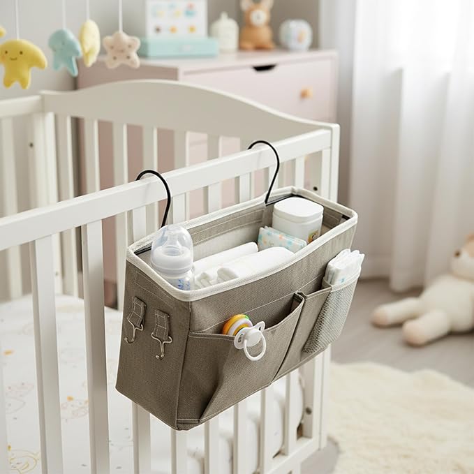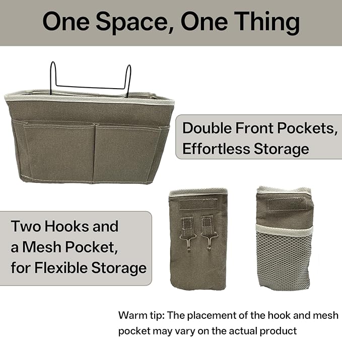 - Premium Material: Crafted with heavy-duty canvas and reinforced iron frame, this bedside caddy ensures long-lasting durability. Features 1 large pocket, 2 small pockets, 1 mesh compartment, and 2 sturdy hooks for versatile storage