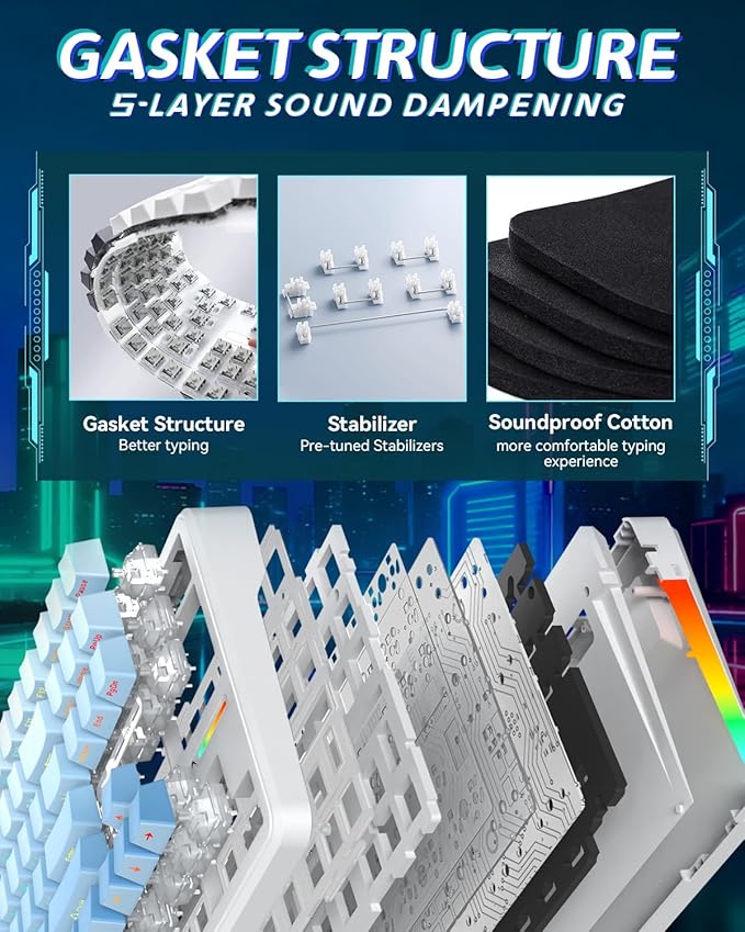 - ELIMINATE SHAKE & NOISE FOR PRECISION – Tired of clacky keyboards and case resonance? The Gasket Mount mechanical keyboard and 5-layer sound-dampening system eliminate the hollow sounds and stabilize the plate, ensuring zero vibration even under rapid-fire key presses. The result is a consistent, professional "thocky" sound and a stable platform, allowing you to focus purely on the game.