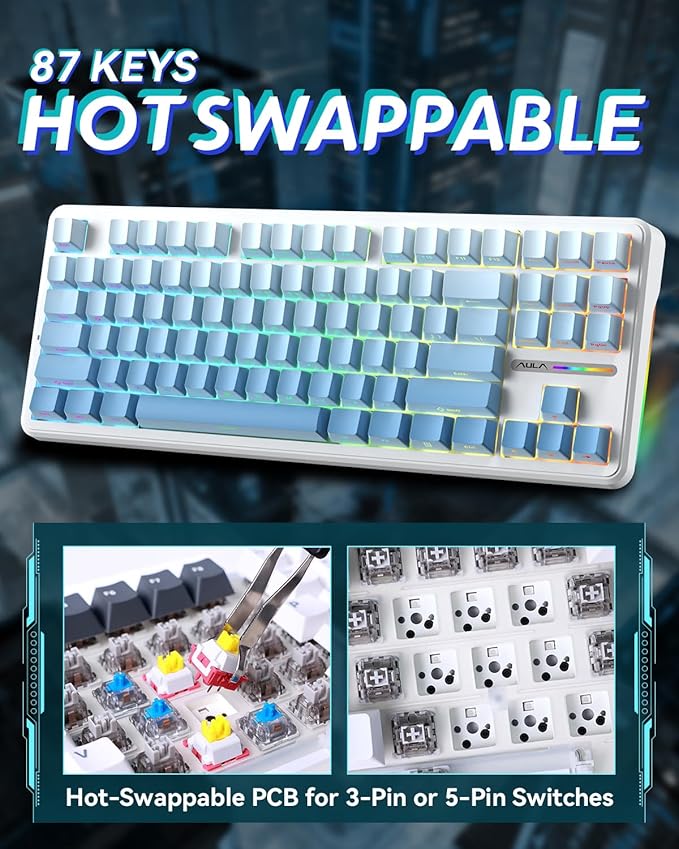 - HOT-SWAPPABLE & DYNAMIC RGB SIDE LIGHTS – The hot-swappable PCB fits all 3-pin/5-pin mechanical switches, allowing for effortless customization without soldering. Features 16.8M colors, 16 preset RGB backlight modes, music sync, and unique side-edge ambient light strips. A visually stunning custom keyboard perfect for personalizing your setup.