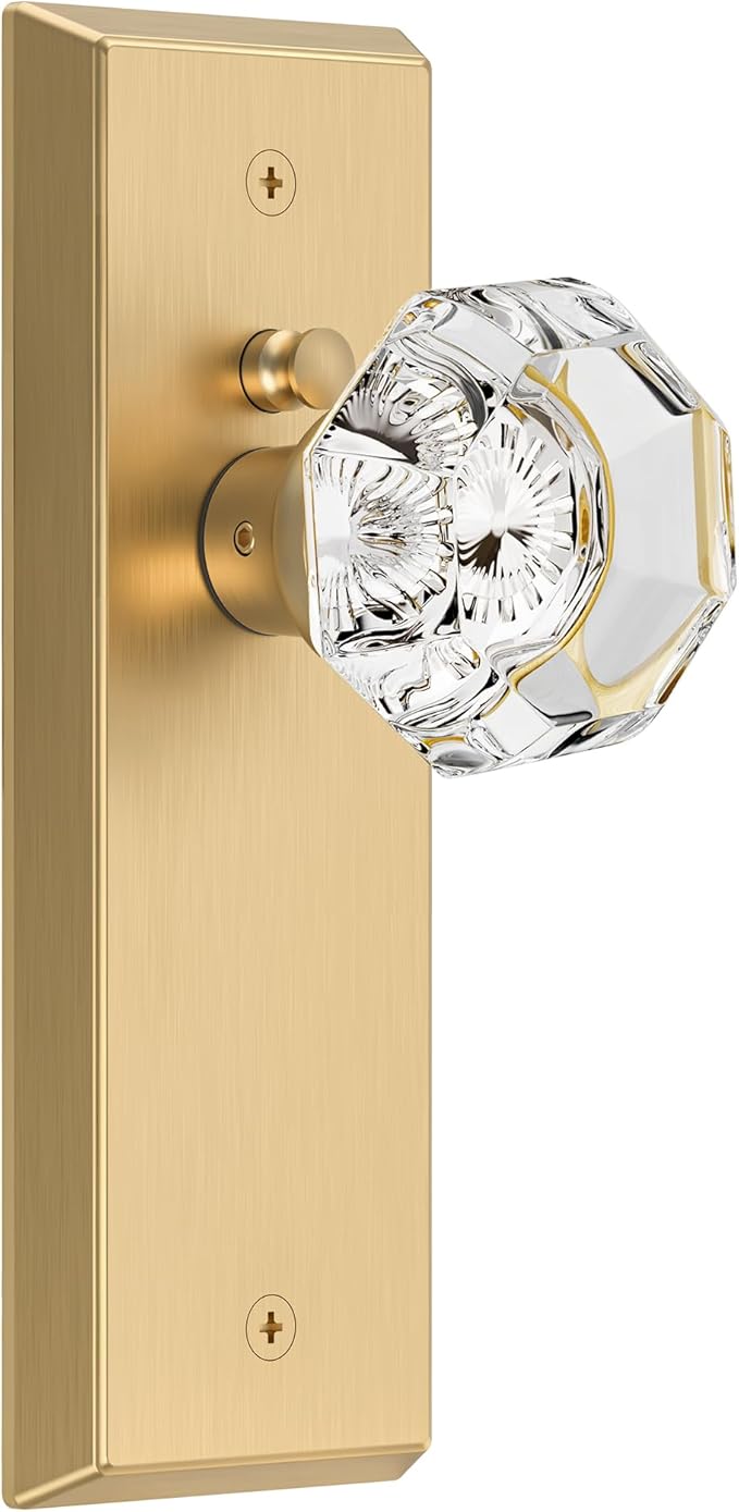 Glass Door Knobs for Interior Doors - Vintage Crystal Privacy Bedroom & Bathroom Door Knob with Lock - Diamond Cut Door Handle - Satin Brass Finish (1 Pack)