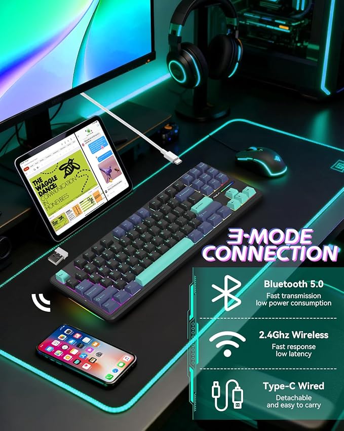 - VERSATILE TRI-MODE & MULTI-DEVICE SWITCHING – Streamline your workflow by connecting up to 5 devices at once. Effortlessly toggle between secure Bluetooth 5.0 (3 channels for Laptop/iPad/Phone), high-speed 2.4GHz wireless, and USB-C wired modes. Whether you are gaming on Windows or typing on macOS/Android, this wireless mechanical keyboard ensures a stable, reliable connection across all your tech ecosystems.
