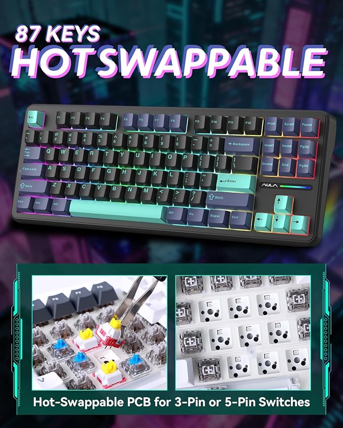 - HOT-SWAPPABLE & DYNAMIC RGB SIDE LIGHTS – The hot-swappable PCB fits all 3-pin/5-pin mechanical switches, allowing for effortless customization without soldering. Features 16.8M colors, 16 preset RGB backlight modes, music sync, and unique side-edge ambient light strips. A visually stunning custom keyboard perfect for personalizing your setup.
