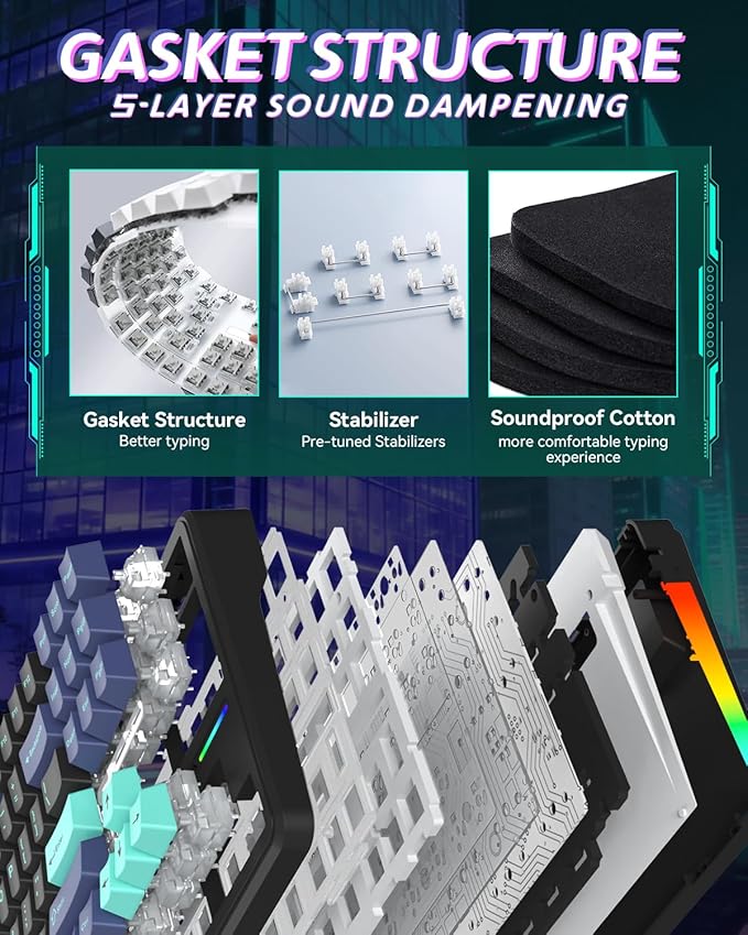 - ELIMINATE SHAKE & NOISE FOR PRECISION – Tired of clacky keyboards and case resonance? The Gasket Mount mechanical keyboard and 5-layer sound-dampening system eliminate the hollow sounds and stabilize the plate, ensuring zero vibration even under rapid-fire key presses. The result is a consistent, professional "thocky" sound and a stable platform, allowing you to focus purely on the game.