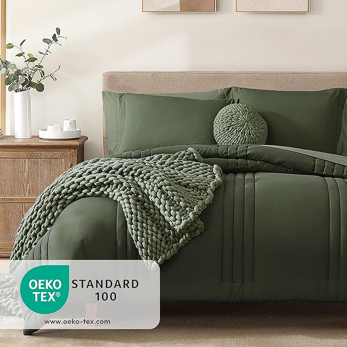 Monbix Oversized King Size Comforter Set - 7 Pieces Olive Green Bed in a Bag Oversized King Bedding Sets with Comforters, All Seasons Comforter Bed Set with Sheets, Pillowcases & Shams