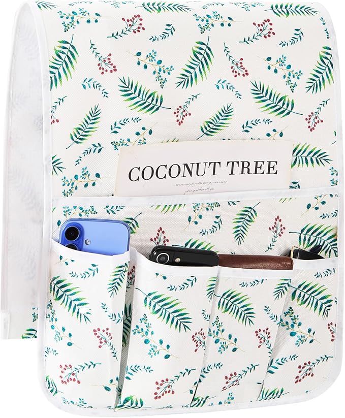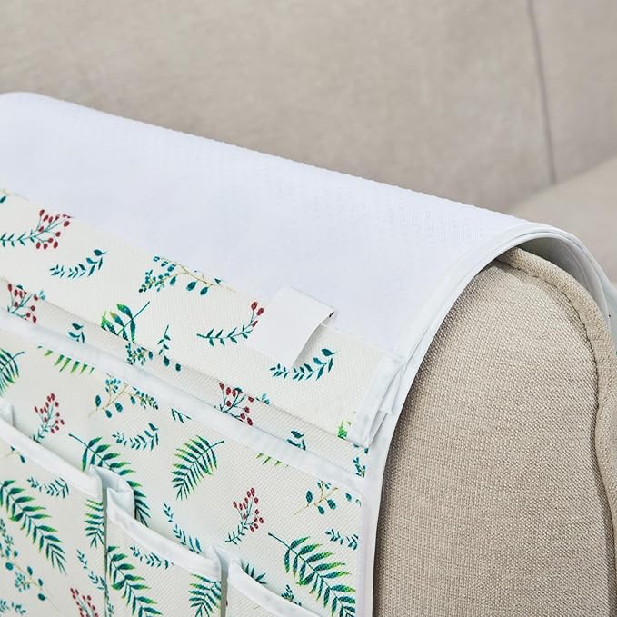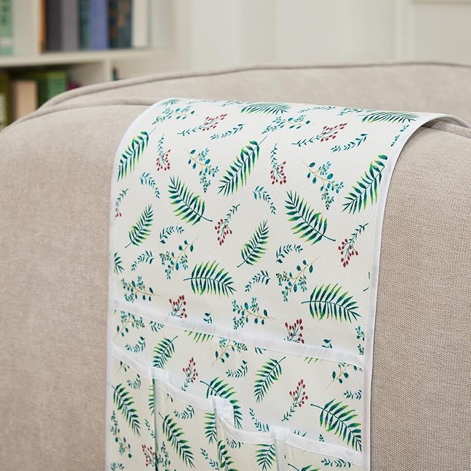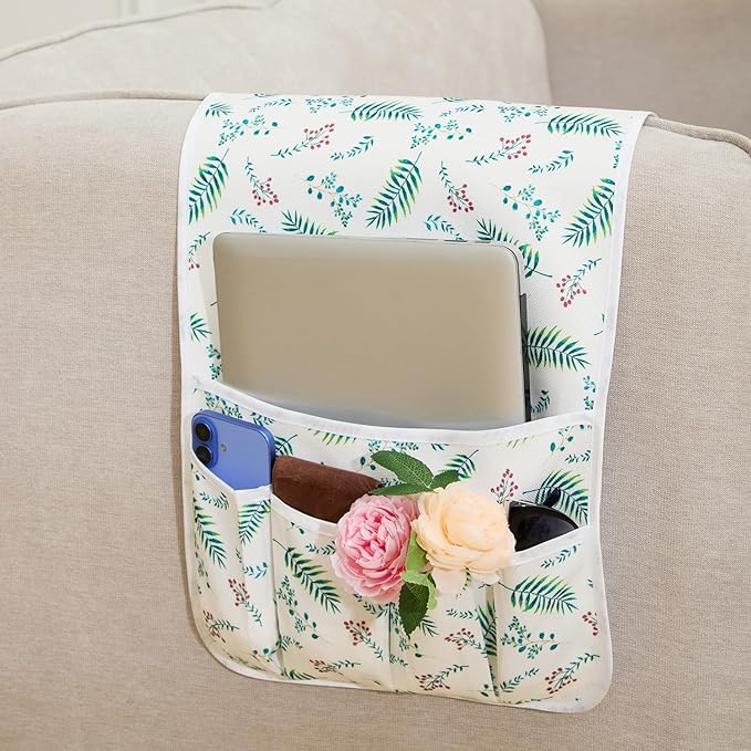FLYILY Sofa Armrest Organizer Non-Slip Arm Chair Hanging Caddy Remote Control Holder for Magazine,Tablet, Phone, Books, Glasses(GreenLeaf,13in)