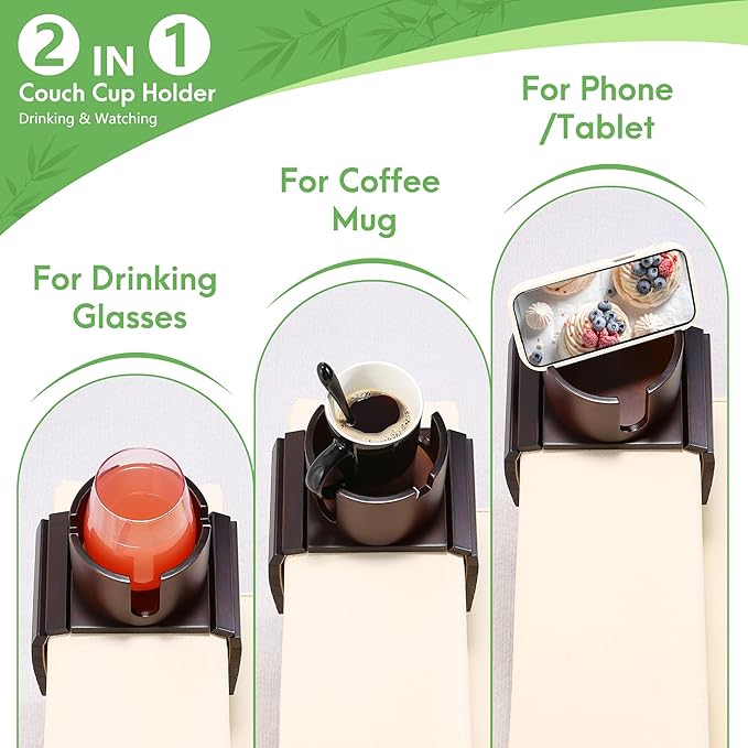 - đ€©ă2 IN 1 Couch Cup Holder & Phone StandăSINWANT couch cup holder is not just a cup holder for couch ,but or a phone stand on sofa armrest-it's both.Keeps drinks in reach.360° rotating couch arm cup holder allows you to adjust the angle and direction freely.Perfer for both left and right-handed users.