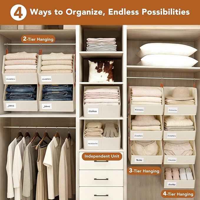 4 Pcs Modular Closet Organizer - Detachable & Foldable Hanging Storage Cubes, 88L Total Capacity, Heavy Duty Fabric Shelves for Wardrobe, Closet Organization, RV, Dorm, Beige