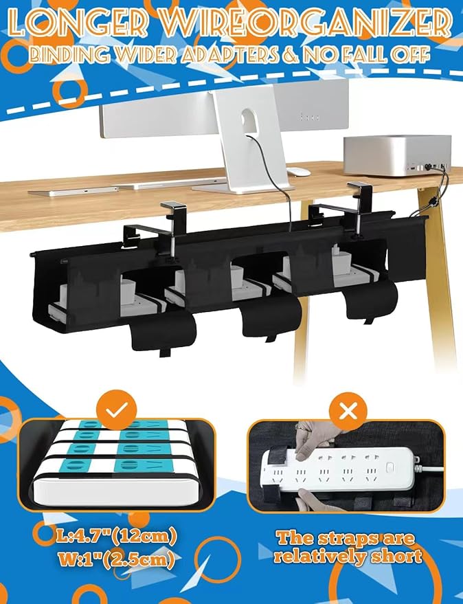 - 【Flame-Retardant 600D Oxford Fabric】Crafted from thick, fire-retardant 600D Oxford fabric, this no drill under desk cable management ensures safety and durability. It features a sturdy bottom support to hold heavy adapters without losing shape, keeping your cables organized securely for long-term use.