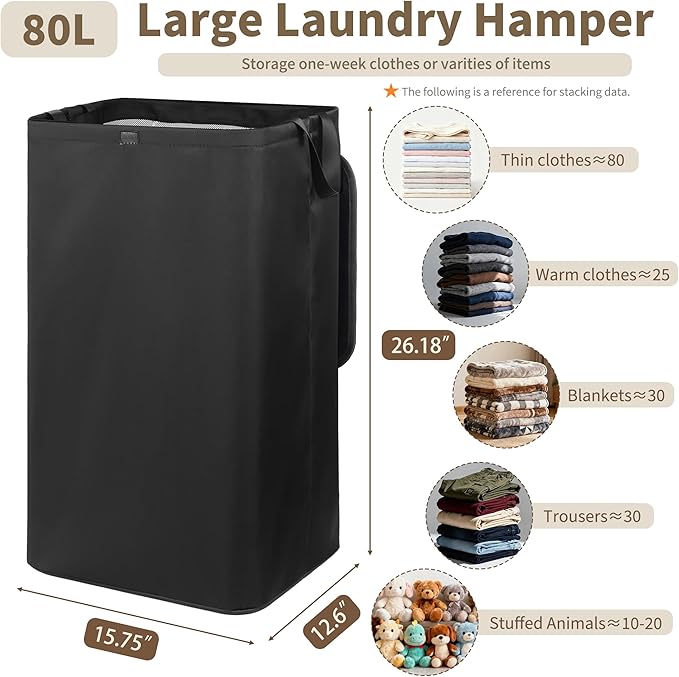 - 【80L Super Capacity】clothes hamper standing size 16.3"L×12.4"W×29.9"H, 100L large capacity clothes bin to meet the week's change of clothes storage, reduce the number of weekly trips to the laundry room.80L tall laundry basket is large enough to hold all the family member's clothes or children's toys.Good choice for campus dorms or family life.