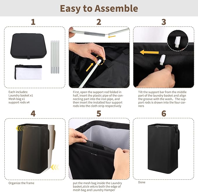 - 【Easy to Install and Foldable】just insert 4 support rods into the fixed tube, you can complete the collapsible laundry basket installation in 1 minute, which is simple and convenient. It can be used as a dirty clothes hamper, but also can be used to store toys, clothes, blankets, and other sundries. It can be easily folded when not in use which is space saving, also suitable for camping and RV trips.