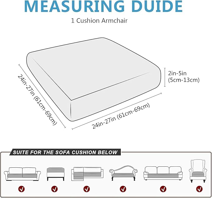 - Fits Most Standard Sofas, Loveseats, Armchairs & Sectionals – Universal Fit Up to 27" x 38" Engineered for versatility, these stretch cushion covers fit most standard-sized sofa, loveseat, armchair, and sectional cushions. Each cover accommodates seat and back cushions up to 27 inches wide and 38 inches deep. Whether you're updating a small apartment couch or protecting a large family sectional, this set offers a snug, tailored appearance with minimal effort.