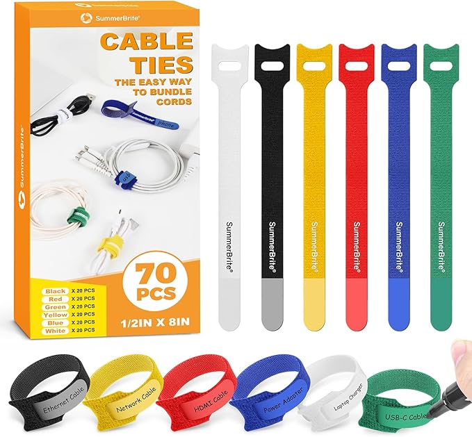 SummerBrite 70 Pack Multi-Color Cable Ties 8 Inch with Writable Labels, Reusable Cord Organizer Straps, Hook & Loop Wire Management for TV, Audio, Ethernet, Electronics & Heavy Duty Cords