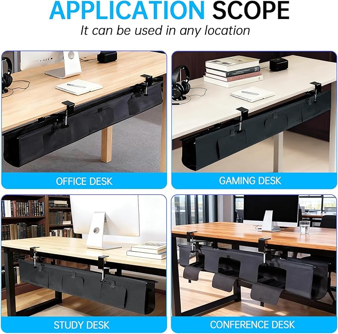 - Durable Fabric Tray: 600D Oxford + PVC coating—waterproof, dustproof, flame-retardant! This cable management tray under desk tames messy wires, hides outlets, and keeps your desk cable management tidy, No more tripping over cords or dust buildup.