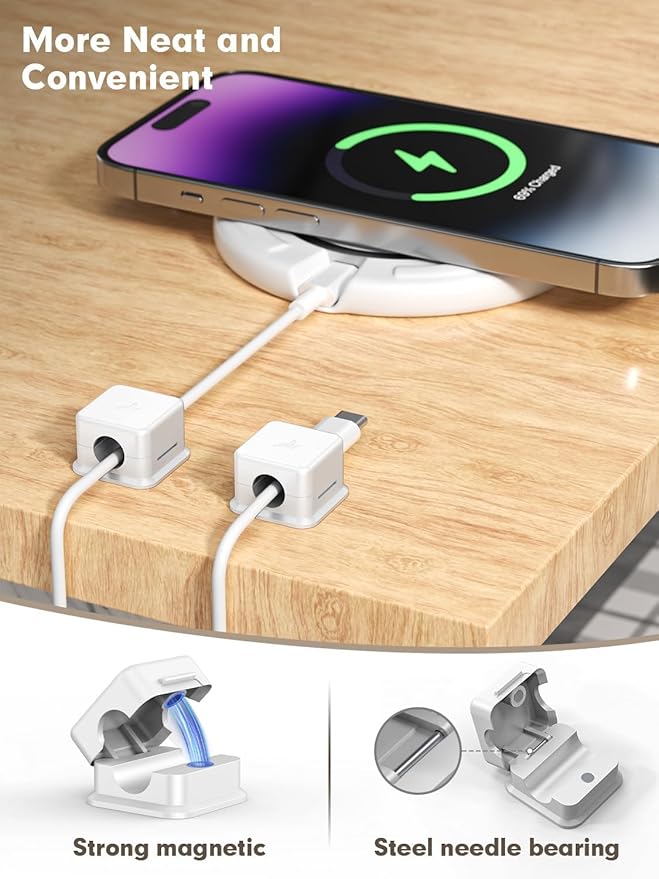 - Magnetic design: The cord organizer is built-in with two powerful magnets, you can finish the cord management operation with one hand. Unlike other all-plastic magnetic cord holders, our cable organizer bearings are made of metal to ensure it will not break in half