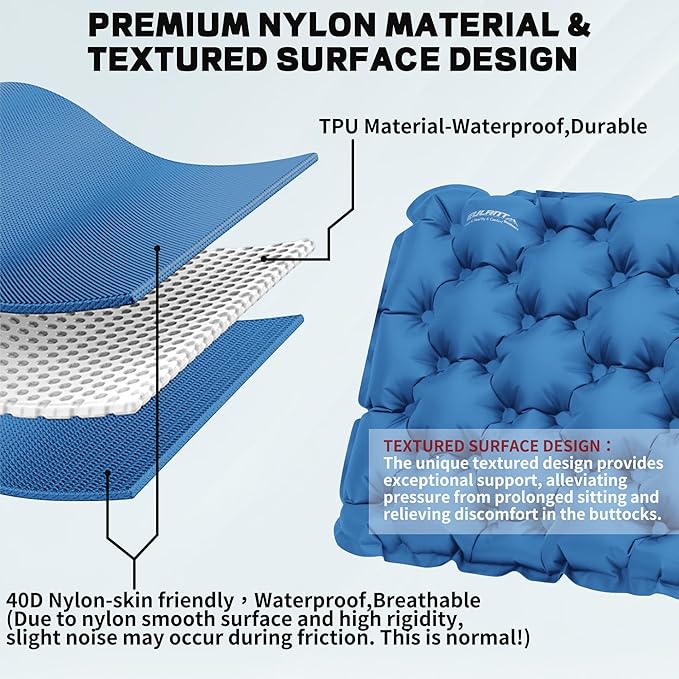 - ★Durable Waterproof Material:Stadium seat cushions are crafted from resilient TPU material and nylon.The nylon offers breathability and softness,while the TPU film layer provides waterproof and moisture-resistant properties,effectively protecting the inflatable cushion from wear and tear.For added peace of mind,each inflatable seat cushion comes with a repair patch,enabling quick and easy fixes in case of accidental punctures.