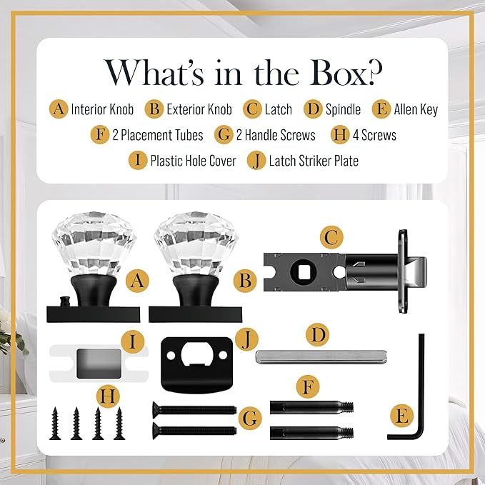 - ๐๐๐๐จ๐ซ๐ญ๐ฅ๐๐ฌ๐ฌ ๐๐ง๐ฌ๐ญ๐๐ฅ๐ฅ๐๐ญ๐ข๐จ๐ง โ Quickly assemble the crystal door knob set with everything included: interior & exterior knob, spindle, latch, striker plate, screws, Allen key, placement tubes, privacy plunger, and instructions. Whether you're installing cool door knobs, vintage style door knobs, glass knobs, or crystal door pullsโsetup is simple and stress-free.