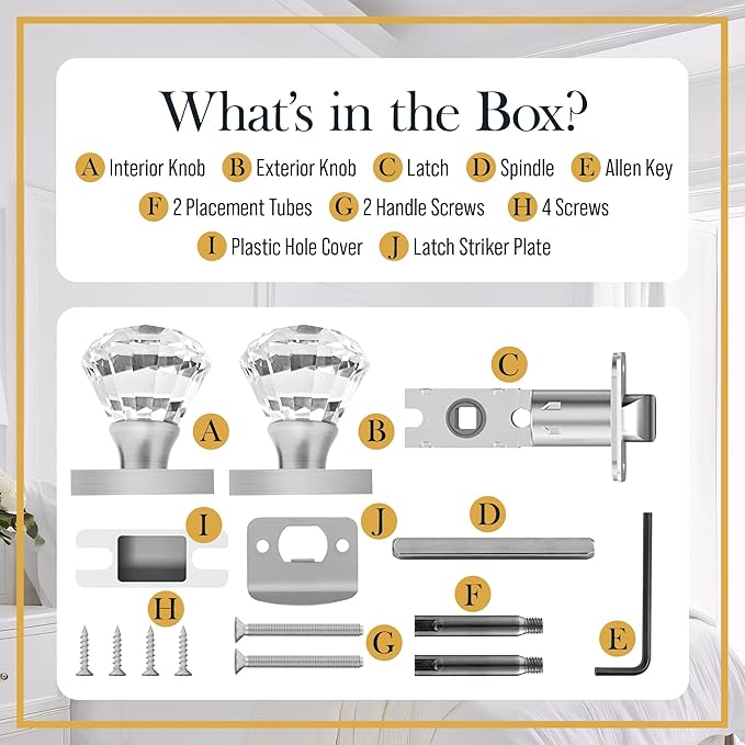 - ๐๐๐๐จ๐ซ๐ญ๐ฅ๐๐ฌ๐ฌ ๐๐ง๐ฌ๐ญ๐๐ฅ๐ฅ๐๐ญ๐ข๐จ๐ง โ Quickly assemble the crystal door knob set with everything included: interior & exterior knob, spindle, latch, striker plate, screws, Allen key, placement tubes, privacy plunger, and instructions. Whether you're installing cool door knobs, vintage style door knobs, glass knobs, or crystal door pullsโsetup is simple and stress-free.