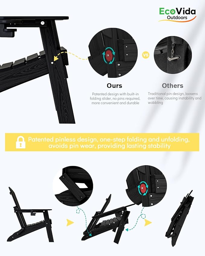 - 【Easy to Fold – No-Pin Folding Structure】 This easy-to-fold Adirondack folding chair adopts a pin-free folding structure, allowing smooth and fast folding and unfolding. Built-in stress blocks eliminate problems caused by long-term pin wear, such as loose joints or unsmooth operation. The result is a durable, space-saving chair that is safer and more convenient, and easy to store.