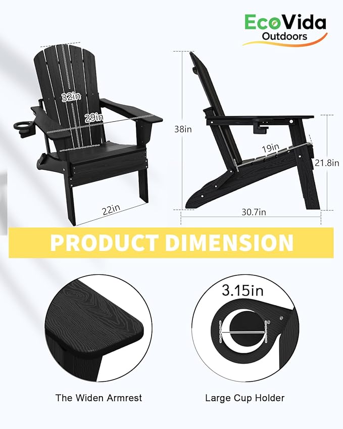 - 【Fits More People – 38-Inch Tall Back Design】 The Ecovidaoutdooors Adirondack Folding Chair features a 38-inch high back, effectively solving common issues such as insufficient head and neck support and back pain caused by long sitting in traditional Adirondack chairs. Designed for ergonomic comfort, it fits perfectly with the American body type, providing comfortable, supportive, pressure-relieving support.