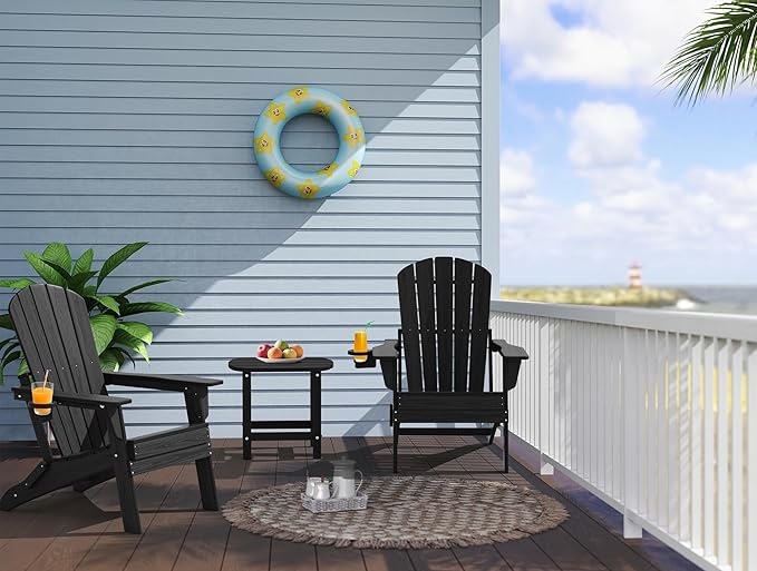 Upgraded Folding Adirondack Chair with All-Weather Cup Holder-EcoVida, Premium Wood Grain Texture, HDPE Waterproof, Suitable for Fire Pit, Patio, Porch, Black