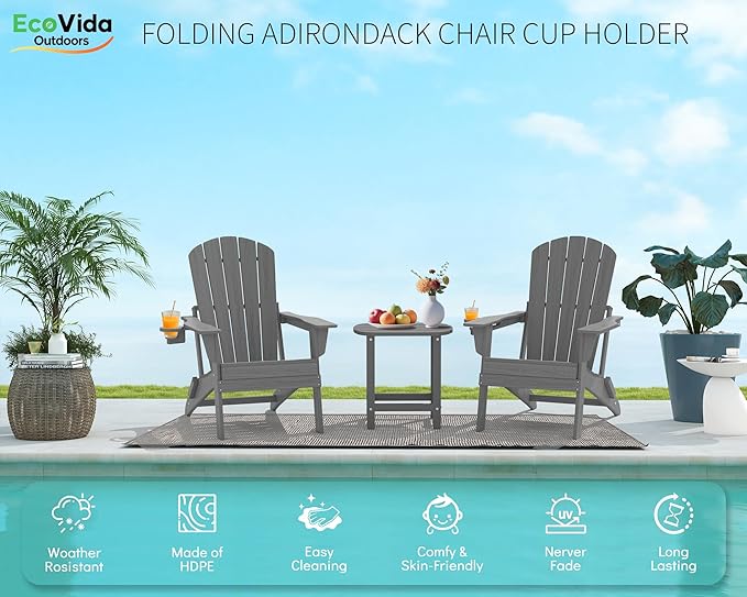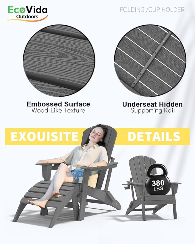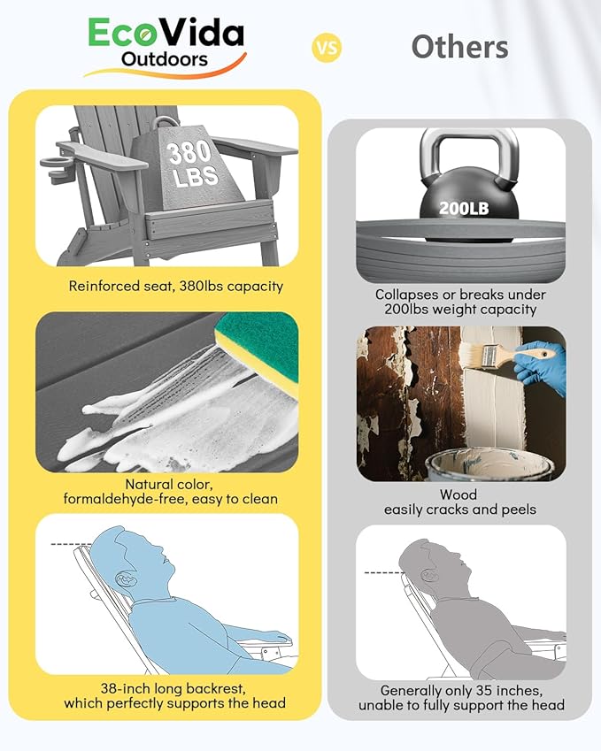 - 【Fits More People – 38-Inch Tall Back Design】 The Ecovidaoutdooors Adirondack Folding Chair features a 38-inch high back, effectively solving common issues such as insufficient head and neck support and back pain caused by long sitting in traditional Adirondack chairs. Designed for ergonomic comfort, it fits perfectly with the American body type, providing comfortable, supportive, pressure-relieving support.The coffee table is made of the same materials and accessories as the chairs, and shares the same features. This listing includes two Adirondack chairs and one coffee table.