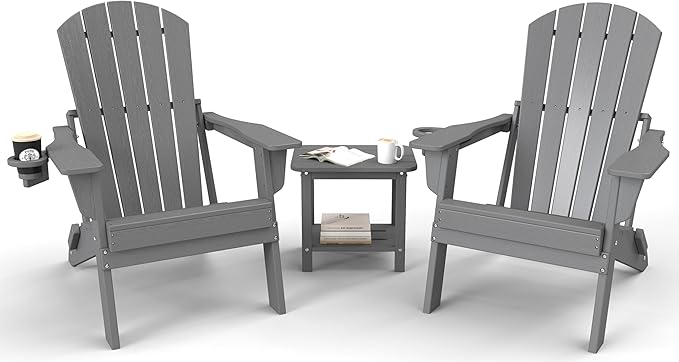3-Piece Folding Adirondack Chair Set - 38" Extra Tall Back & Embossed Wood Grain, Oversized HDPE Patio Furniture with Side Table & Cup Holders, 380lb Heavy Duty,Grey