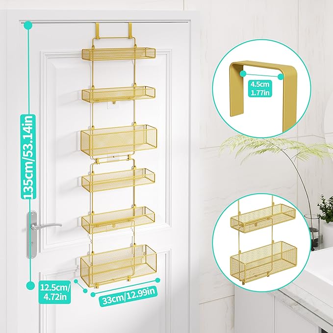 - [Multifunctional Door Rack Organizer]: Versatility meets functionality with the door hanger organizer. Whether you need extra storage in the bathroom, kitchen, bedroom, or laundry room, this multifunctional over door storage organizer adapts to your needs. Use back of door storage to store bath products, cleaning supplies, pantry items, cosmetics, towels, dolls, bags, baby products, snacks, bottles, spice bottles or accessories, within arm's reach, making it a practical addition to any room in your home