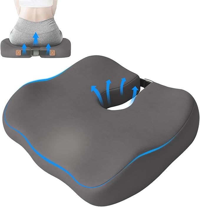 - 【Ergonomic U-Shape Design for Tailbone & Coccyx Pain Relief】Professionally designed with an orthopedic U-shaped cutout and central hole, this seat cushion completely eliminates pressure on your tailbone (coccyx). The adjustable straps ensure a customized, secure fit for your hip size, promoting proper spinal alignment and a healthy sitting posture during long hours at the office or home desk