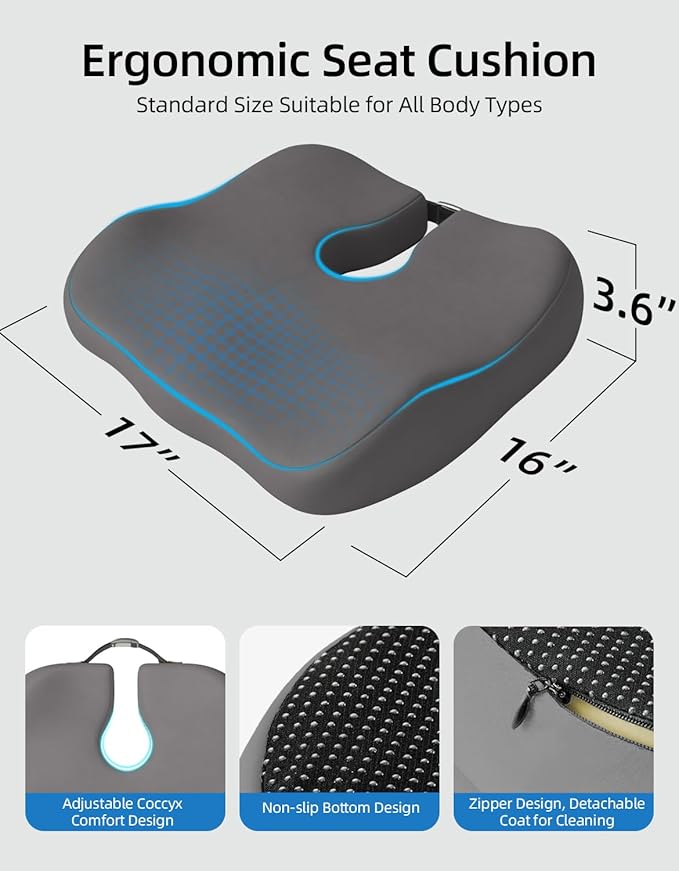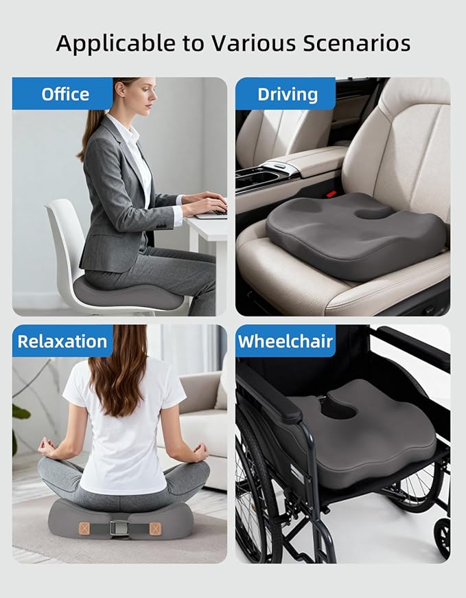 - 【Versatile & Portable for Office, Car, and Home Use】Lightweight and easily portable, this cushion is your go-to comfort upgrade for multiple scenarios. Enjoy premium ergonomic support on your office chair, car seat, wheelchair, gaming chair, or even dining chair. It transforms any seat into a more comfortable and supportive space for work, travel, or relaxation.