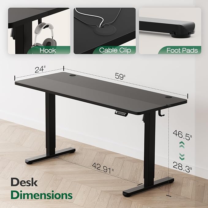 - 【Spacious & Ergonomic 59-Inch Workstation】Enjoy ample room to spread out with this expansive 59-inch electric standing desk. Designed to comfortably fit dual monitors, a laptop, and all your essential work tools, it creates an organized, clutter-free workspace that adapts to both focused tasks and creative projects.